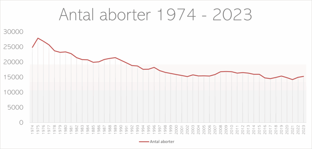 Denne grafik viser, hvordan aborttallet har udviklet sig siden indførelsen af fri abort i 1973 og frem til 2023. Generelt er aborttallet faldet siden 70’erne og helt frem mod årtusindskiftet. Herefter er det stagneret aborttallet omkring 15.000 årligt. Kilde: Sundhedsstyrelsens abortregister.