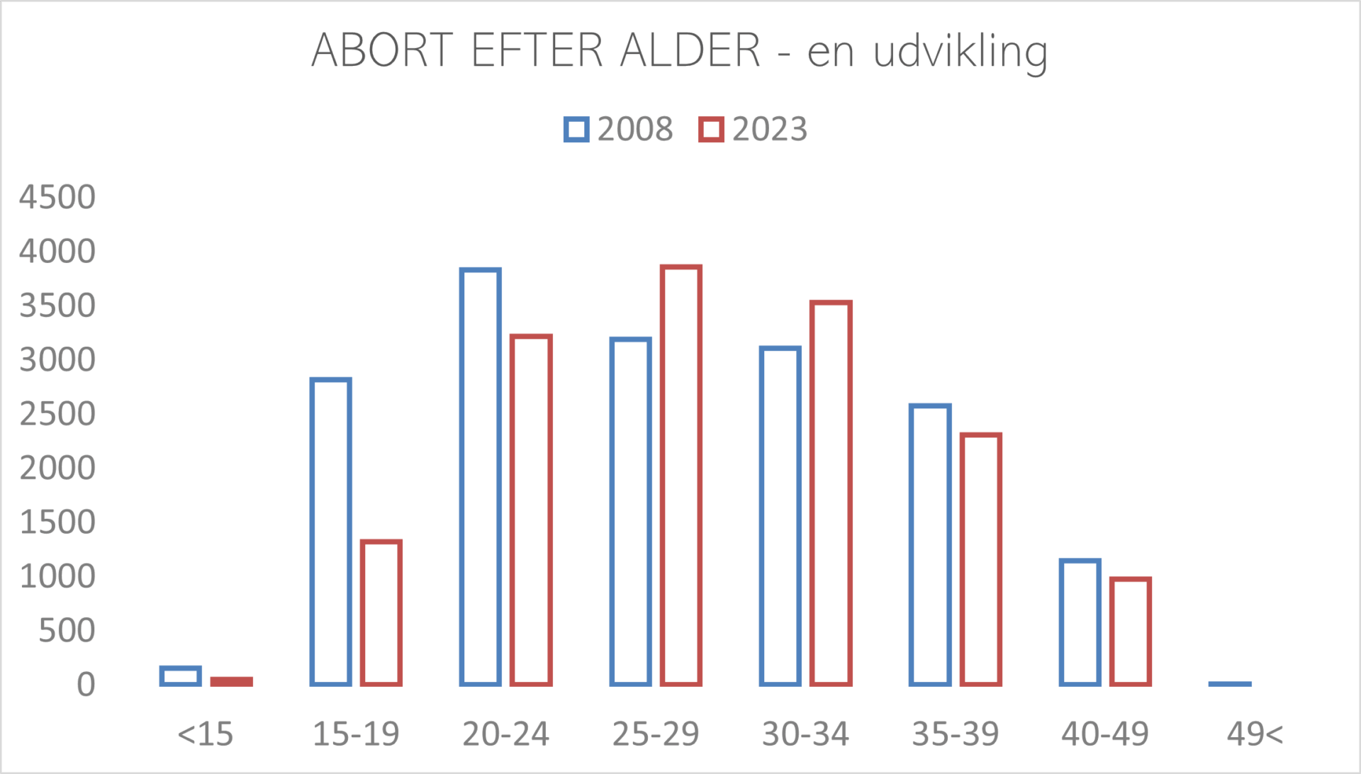 Denne grafik viser udviklingen i antallet af aborter fra 2008 til 2023 er fordelt på de forskellige alderstrin. Der ses et markant fald i antallet af aborter blandt de helt unge. Kun blandt de 25 – 35 årige er der sket en stigning i antallet af aborter. Kilde: Sundhedsstyrelsens abortregister.